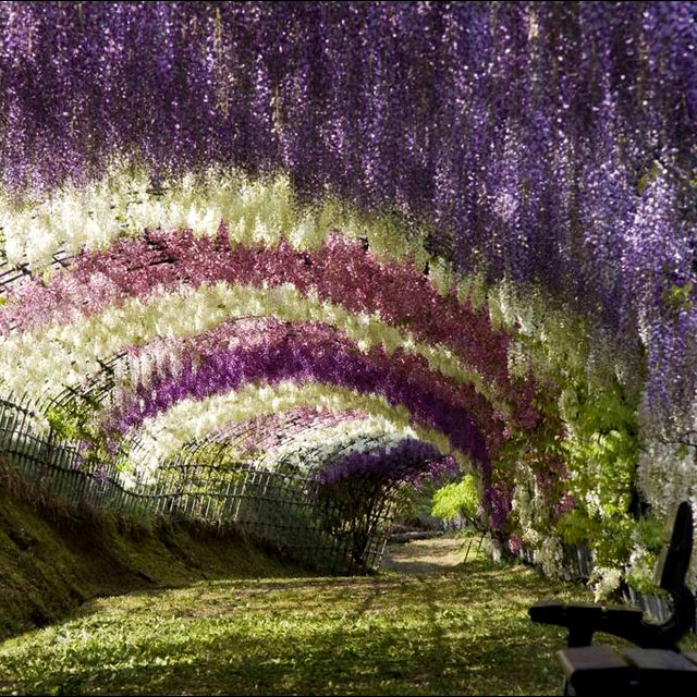 Localizado na cidade de Kitakyushu, Japão, o jardim Kawachi Fuji abriga uma variedade incrível de plantas floridas, abrangendo 20 espécies diferentes de glicínias (nome popular para as plantas do gênero Wisteria). A atração principal do jardim é o túnel de glicínias de 46 metros que permite aos visitantes caminhar numa encantadora passagem repleta de cor. À cerca de 6 horas de Tóquio, a melhor época para visitação vai do final de abril à meados de maio. Como se trata de um jardim privado é necessário o pagamento uma taxa de entrada para a visitá-lo. Foto: Wicker Paradise |