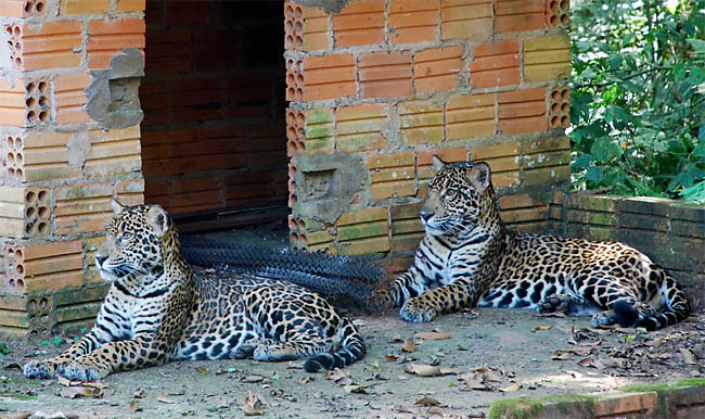 Dois machos subadultos de onça-pintada, muito provavelmente irmãos, muito à vontade junto às instalações do antigo canil na base do projeto, em foto tirada na semana passada (foto Apolônio Rodrigues)
