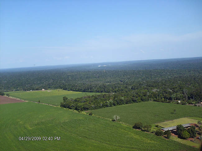 Foto da mata contínua do parque, com propriedades vizinhas, e com as cataratas aparecendo ao fundo.