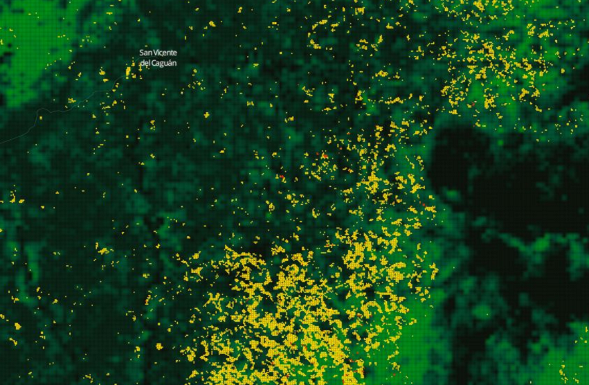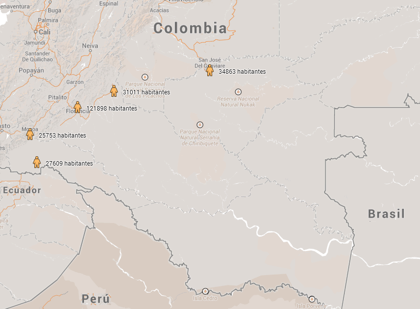 O georeferenciamento dos pontos de desmatamento, conforme monitoramento via satélite, permite apontar que o problema agravou-se na última década principalmente no entorno das principais cidades da Amazônia colombiana. As cinco capitais mais populosas da Amazônia colombiana têm servido de ponto de apoio para a extração de madeira e derrubada da floresta. Nos mapas abaixo, é possível observar, respectivamente, onde a devastação acontece e onde estão os principais centros urbanos (clique nas imagens para interagir e ver detalhes nos mapas). No terceiro, está visível o impacto no entorno de San Vicente del Caguán, uma das regiões mais afetadas.