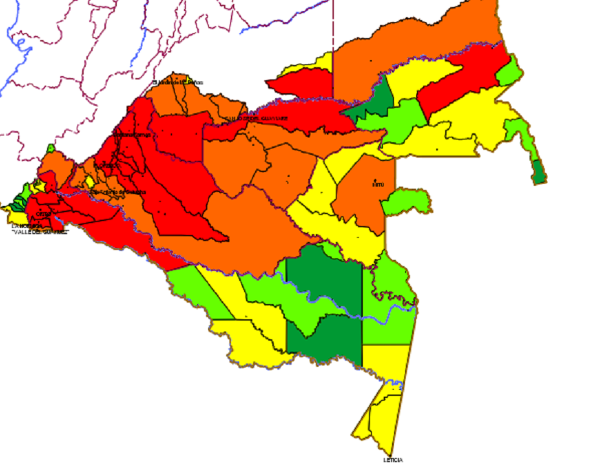 O desmatamento coloca em risco uma zona rica em biodiversidade. Dados do Sistema de Informações sobre Biodiversidade do país indicam que já foram identificadas na Amazônia colombiana 74 aves aquáticas, 158 anfíbios, 195 repteis, 11.500 plantas, 27 espécies de aves e 15 de orquídeas. Levantamentos com dados do período entre 2002 e 2007 já indicam que a área ao redor das grandes cidades da Amazônia colombiana era a que estava mais sujeita a pressões socioambientais, conforme o mapa abaixo (clique para ver detalhes).