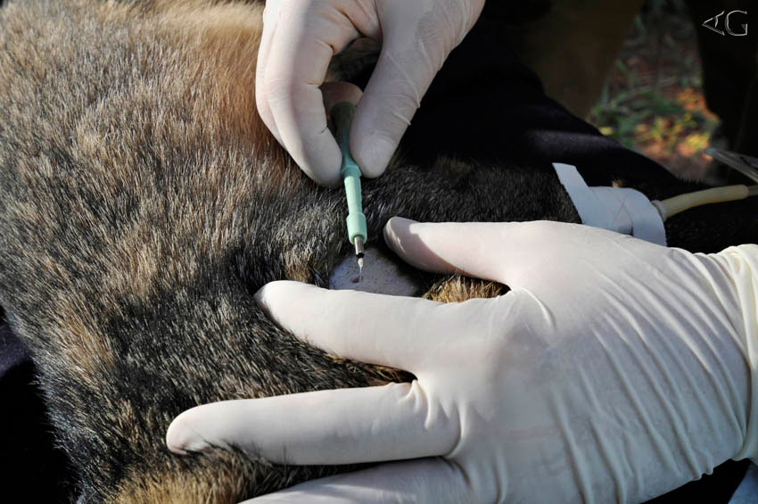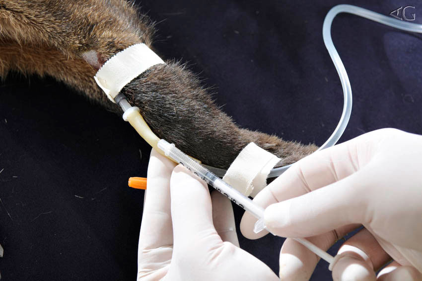 Enquanto Rick avalia o animal na armadilha e estima o peso do mesmo, Caio, com larga experiência no manejo e contenção dos grandes animais do Zoológico, prepara a dose anestésica a qual monitora de perto. Um dos seus objetivos é definir um protocolo ideal para estas espécies. Além disso, ele aplica logo o soro e acompanha os batimentos cardíacos, a frequência respiratória e a temperatura do animal, auxiliado pelos outros veterinários e Carol Oliveira, trainee do Zoológico de São Paulo.