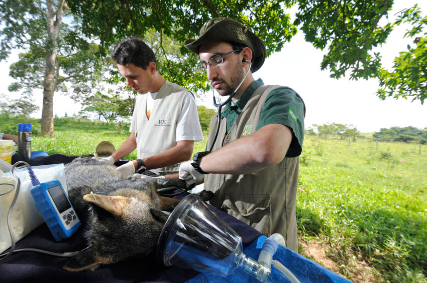 Uma das maiores preocupações do Programa de Conservação Mamíferos do Cerrado (PCMC) está em conhecer a saúde dos bichos que vêm sendo estudados sistematicamente desde 2008. Tanto é que uma das estratégias para esta longa campanha foi criar parcerias com instituições que trabalham especificamente com pesquisas epidemiológicas e de saúde de fauna silvestre. Assim, Caio Motta, veterinário do Zoológico de São Paulo (FPZSP), Fabiana Lopes e Andre Roque, do Instituto Oswaldo Cruz (Fiocruz), chegaram dias antes do início da campanha para, juntamente com Ricardo Arrais, veterinário responsável pelo Programa, organizarem e definirem os protocolos de coleta de amostras biológicas dos animais a serem capturados.