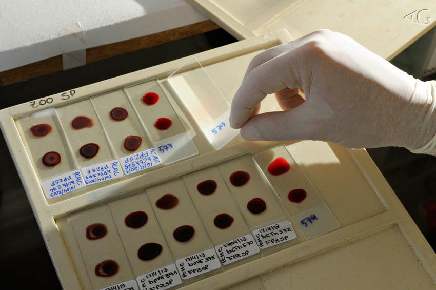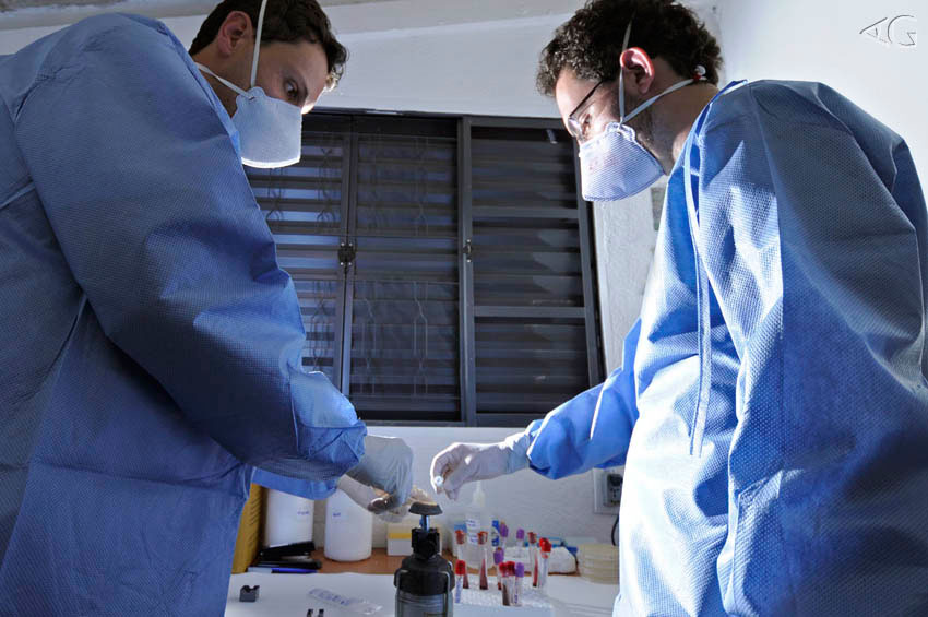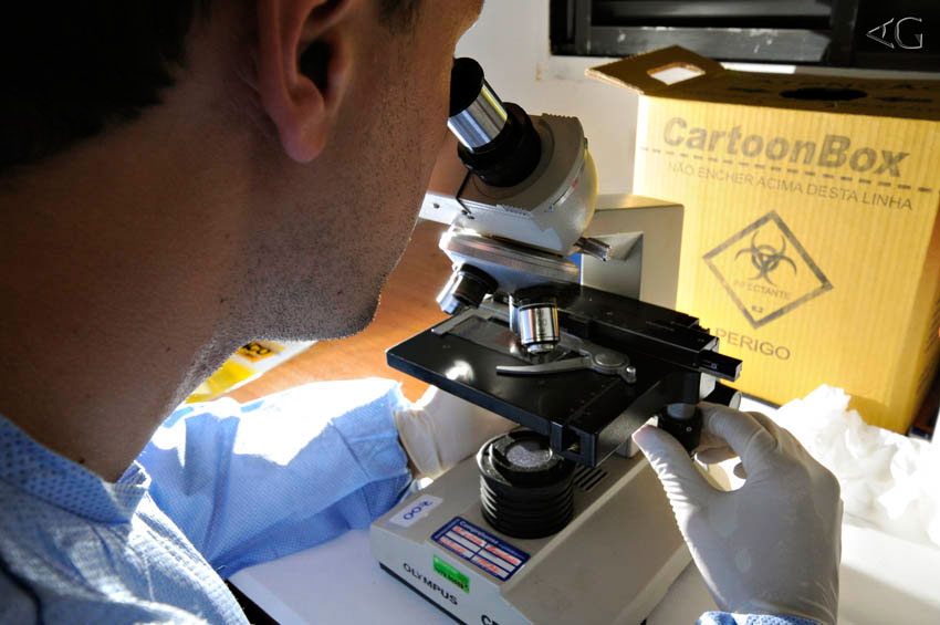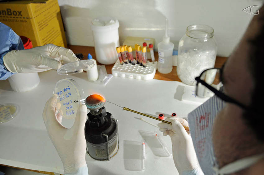 Toda tarde, depois do trabalho de campo, os “médicos dos bichos” voltam à base e se enclausuram no laboratório para processar as amostras. Roupas esterilizadas, luvas cirúrgicas, centrífuga ligada e o pequeno fogareiro aceso. Desta forma, trabalhando perto do fogo, Caio e André conseguem manter o ambiente razoavelmente esterilizado para prepararem as amostras de cultura. Tais amostras estão sendo periodicamente buscadas na fazenda e levadas rapidamente para os diversos laboratórios e instituições envolvidas. (FioCruz, Zoológico de SP, diversos laboratórios da Universidade Federal de Uberlândia (UFU), FACIP-UFU, UFSCAR, USP/VRA-FMVZ, CENAP/ICMBio, Smithsonian Conservation Biology Institute e George Mason University).