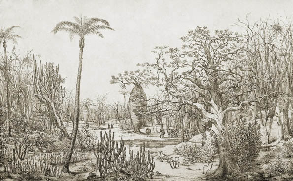 | Paisagem desenhada na expedição de Martius, no início do século 19, exibe vegetação rarefeita com cactos, palmeiras e até uma barriguda (Cavanillesia umbellata). Fonte: Flora brasiliensis online, Centro de Referência em Informação Ambiental, CRIA. |