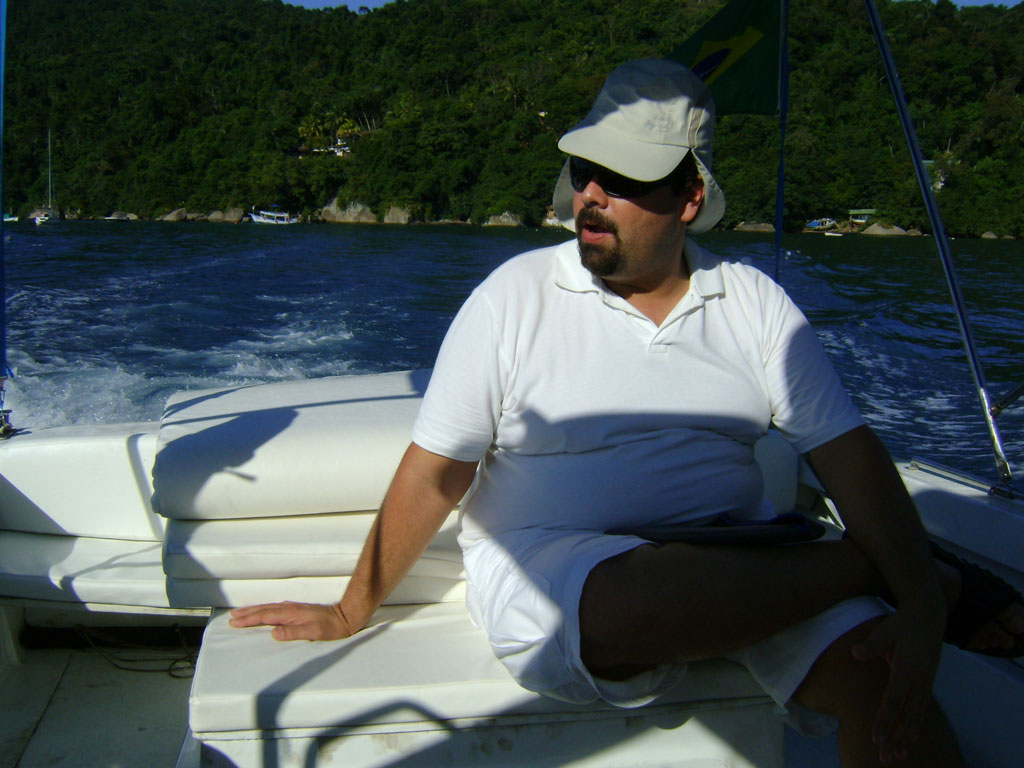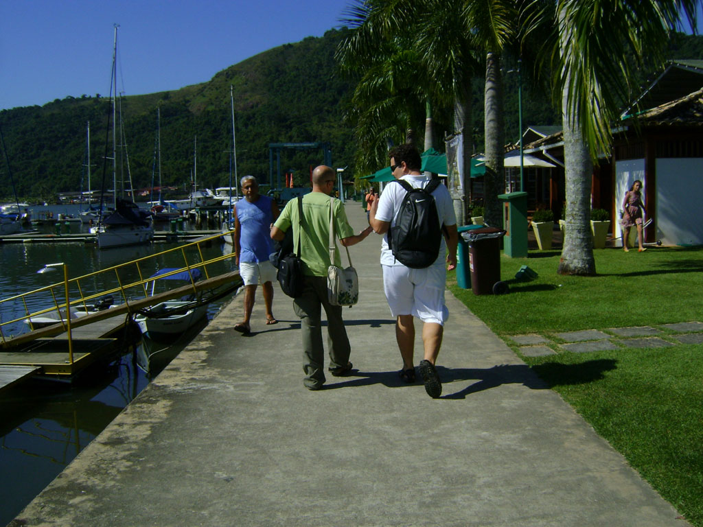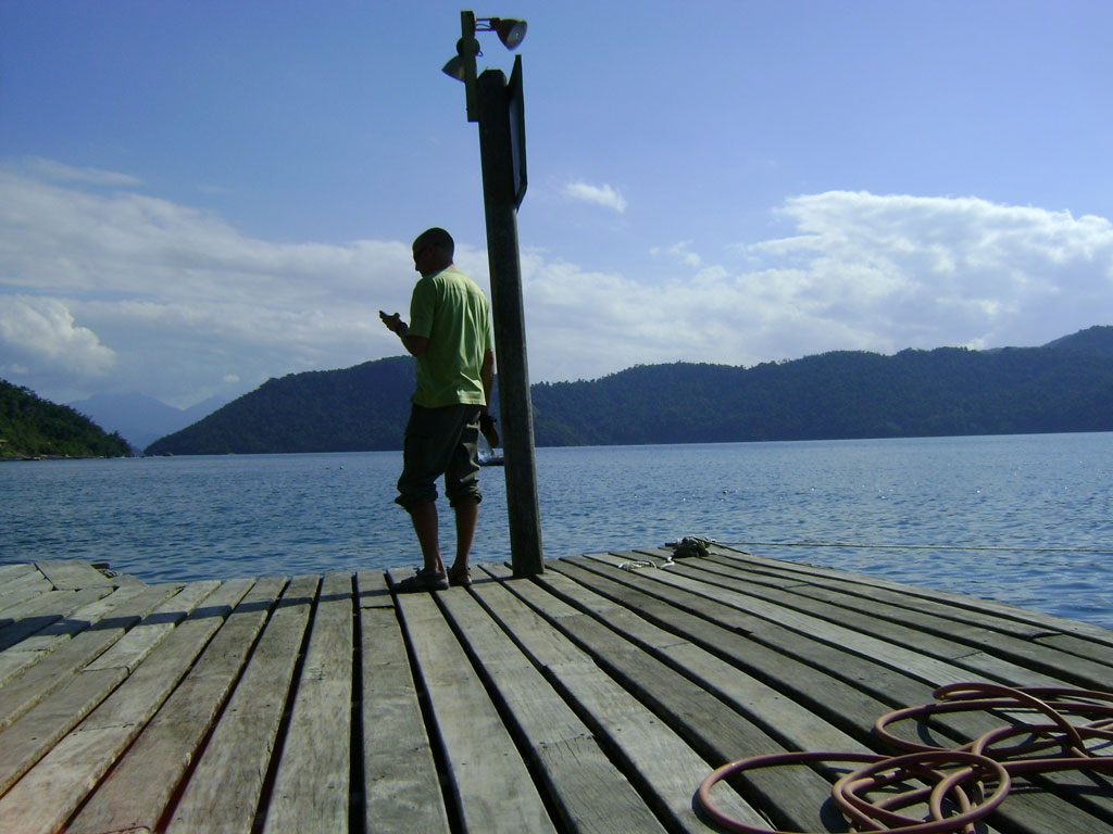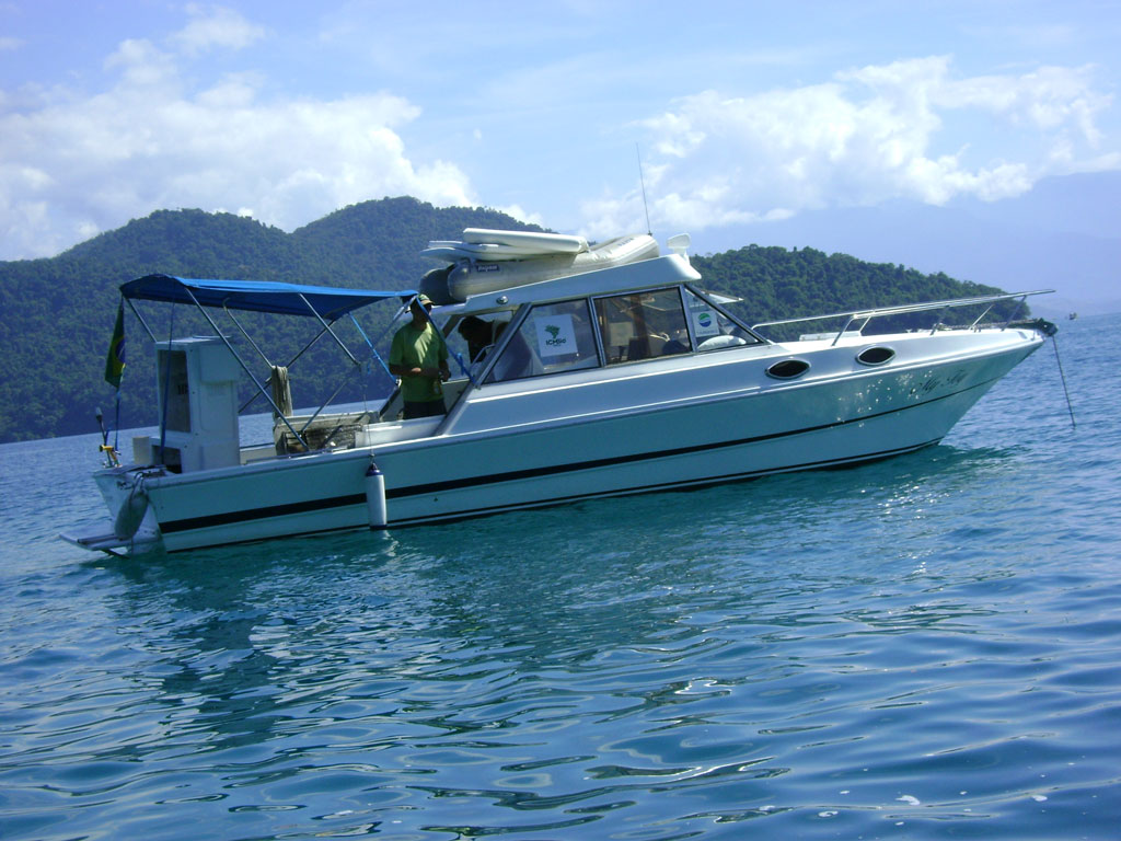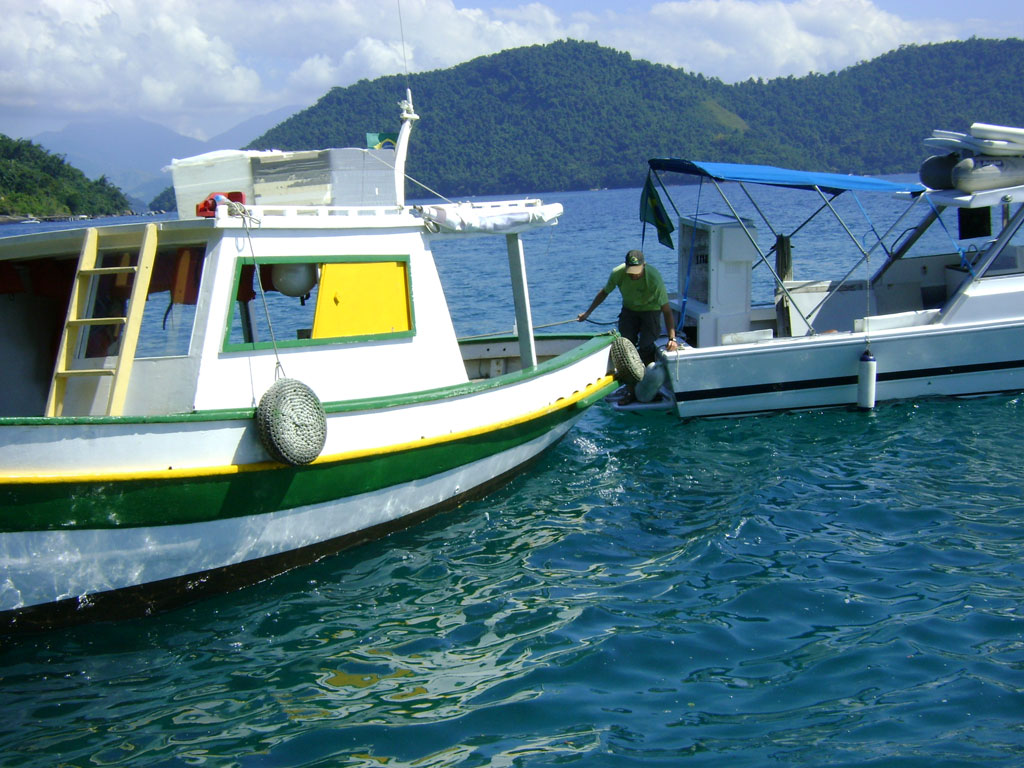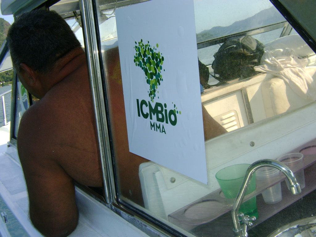 A APA não tem barco para fiscalizar as 63 ilhas sob sua administração. A lancha que utiliza é custeado pela ONG SOS Mata Atlântica, que tem um convênio antigo com a unidade. Nela, partimos com o objetivo de mostrar a ((o))eco a situação das ilhas. A bordo estão Antônio, o barqueiro, Bruno de Brito Gueiros Souza, Analista ambiental recém-transferido para a APA Cairuçu e Eduardo Godoy, chefe da APA Cairuçu.