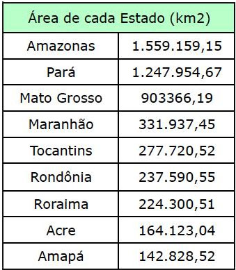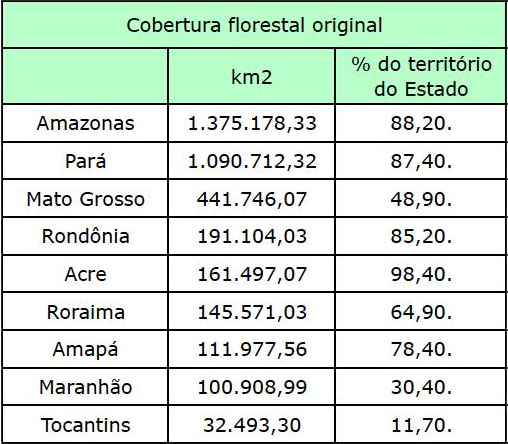 | Estado | km² | Quanto representa da Amazônia original do Estado (%) |