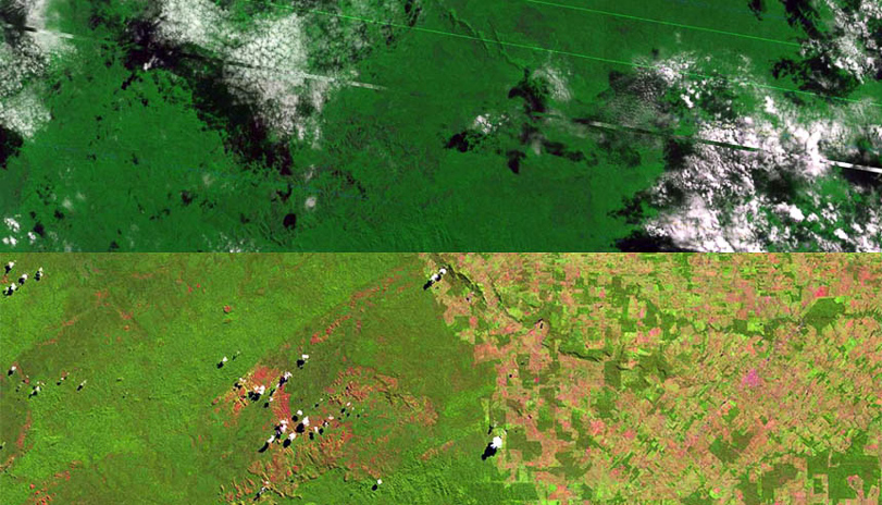 Colhidas pelos satélites do programa Landsat, duas imagens mostram o efeito de quase 40 anos de desmatamento na Amazônia. A primeira, acima, retrata Rondônia em 1972, quando menos de 2% de suas florestas haviam sido derrubadas. A segunda é do ano de 2009, quando praticamente um terço de suas árvores já não existiam mais. Enquanto isso, Pacaás Novos perdeu apenas 0,17 % de sua floresta.
