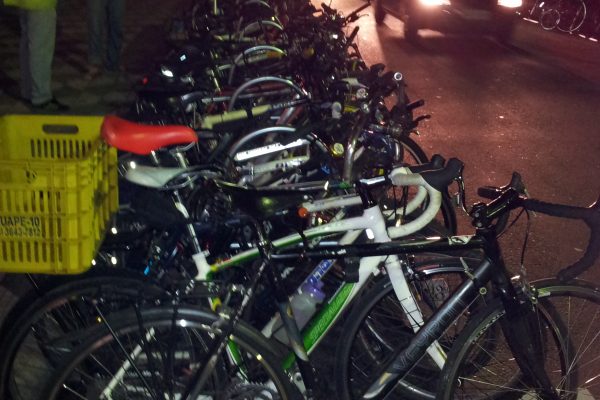 A Associação de Ciclistas Urbanos de São Paulo (Ciclocidade) organizou um estacionamento de bicicletas na porta do Sesc Pinheiros, em São Paulo, para o evento Bicicletas, Cidades e o Futuro da Mobilidade na noite de terça-feira, 12 de julho. →
