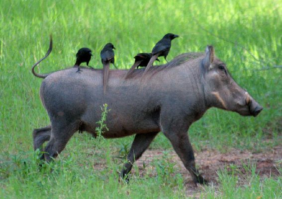 Adultos pesam entre 50 e cem quilos e são vistos muitas vezes dando carona a aves que se alimentam de insetos afugentados. →