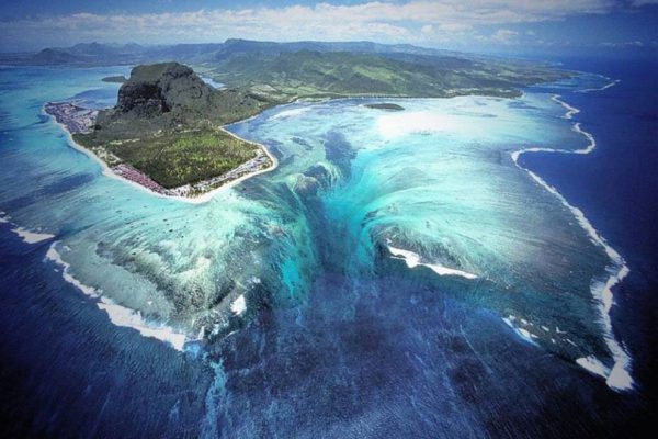 Uma visão aérea da ponta sudoeste da Ilha Maurício revela uma surpreendente ilusão: uma cachoeira dentro do mar. Foto: Fotógrafo desconhecido →
