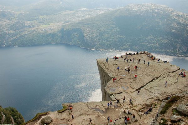 O topo da falésia, que se ergue a 604 metros de altura, é uma das atrações turísticas mais visitadas da Noruega. Foto: Tijs Vrolix →