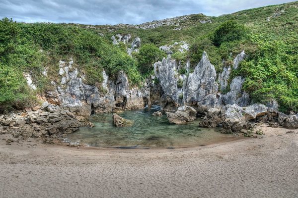 A praia de Gulpiyuri não está no litoral, mas a 100 metros da costa, no meio de um pasto ao norte do povoado de Nandes, na Espanha. Foto: ospanacar →