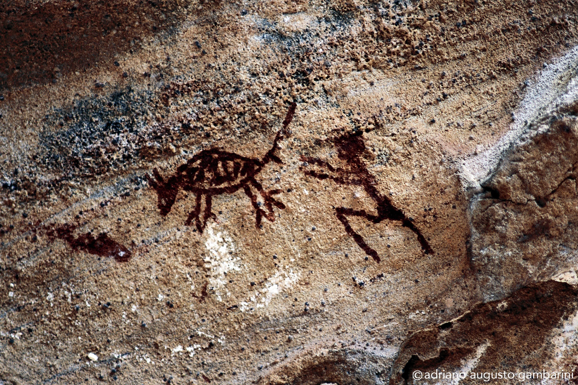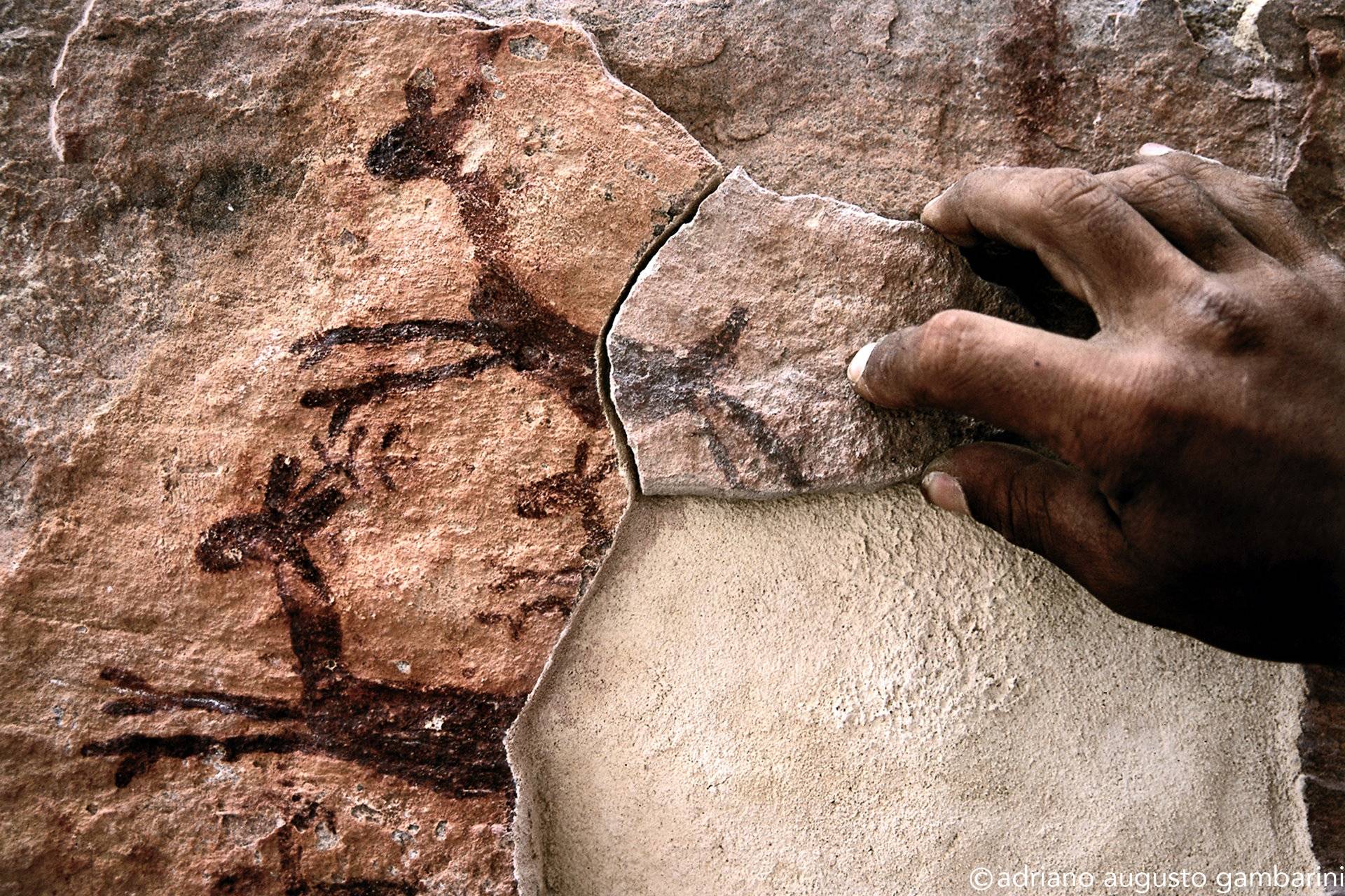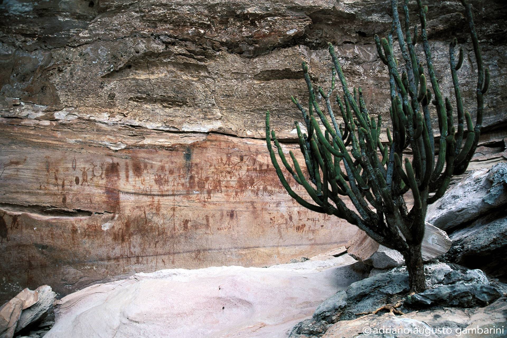 Certo dia, quando Niède já sabia do meu envolvimento na documentação sistemática de projetos de pesquisa com onças-pintadas, levou-me a um sítio arqueológico não aberto a visitação. Minha empolgação em cruzar a Caatinga seca para alcançar um lugar onde só arqueólogos tinham acesso, era enorme. Horas de carro e mais um tanto de caminhada e lá chegamos num pequeno abrigo de pedra. Discreta na penumbra, encontramos uma pintura rupestre representando uma verdadeira caçada: uma pequena onça expondo as unhas, com as orelhas arredondadas, cercada por dezenas de pequenas figuras humanas carregando lanças. Me transportei no tempo e imaginei aquele momento. Percebi a exata percepção das dimensões da cena que o ‘artista’ quis representar: o tamanho do animal perto da figura diminuta dos caçadores. E porque não dizer o respeito ao grande predador que aqueles homens já tinham.