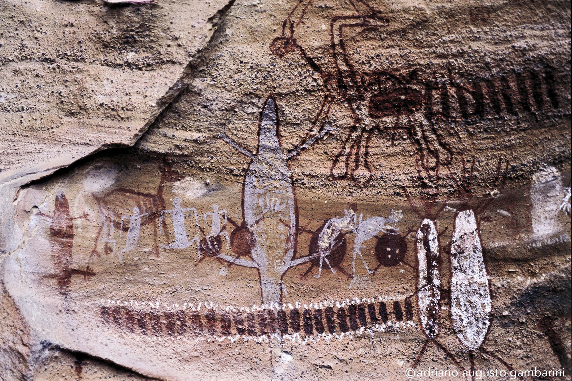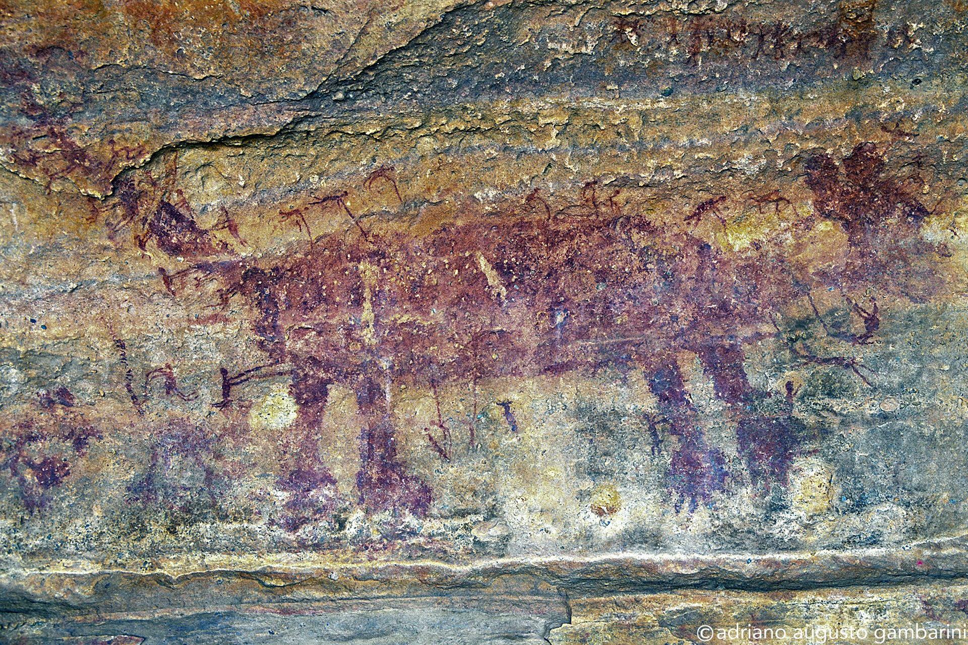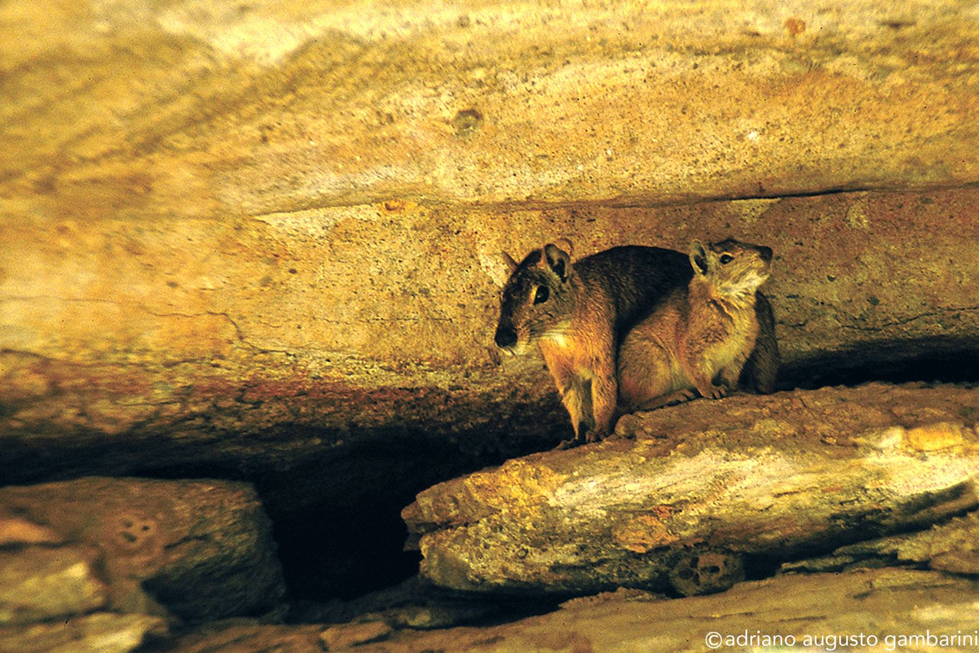 Certo dia, quando Niède já sabia do meu envolvimento na documentação sistemática de projetos de pesquisa com onças-pintadas, levou-me a um sítio arqueológico não aberto a visitação. Minha empolgação em cruzar a Caatinga seca para alcançar um lugar onde só arqueólogos tinham acesso, era enorme. Horas de carro e mais um tanto de caminhada e lá chegamos num pequeno abrigo de pedra. Discreta na penumbra, encontramos uma pintura rupestre representando uma verdadeira caçada: uma pequena onça expondo as unhas, com as orelhas arredondadas, cercada por dezenas de pequenas figuras humanas carregando lanças. Me transportei no tempo e imaginei aquele momento. Percebi a exata percepção das dimensões da cena que o ‘artista’ quis representar: o tamanho do animal perto da figura diminuta dos caçadores. E porque não dizer o respeito ao grande predador que aqueles homens já tinham.
