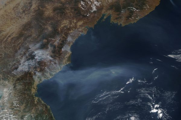 Imagem de fumaça de incêndios florestais na Coréia do Norte revela diferenças entre pluma de poluição por queima de biomassa e nuvem de chuva sobre o mar. →