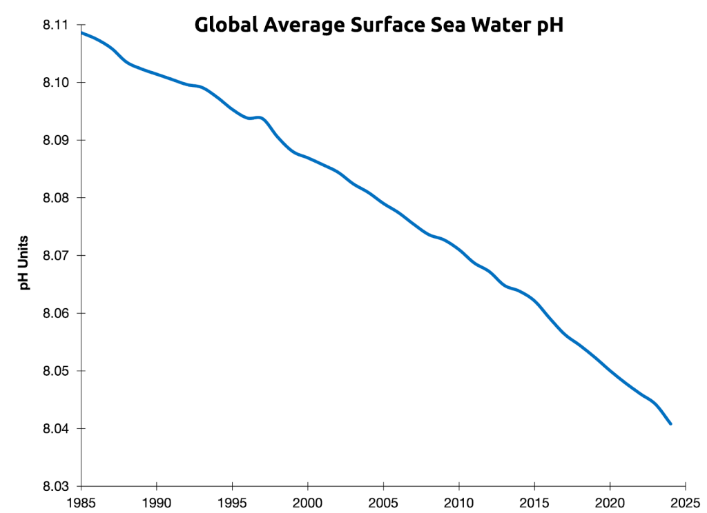 A queima de combustíveis fósseis pela atividade humana afeta os oceanos da Terra por meio de um duplo impacto: o aquecimento e a acidificação das águas, que ocorre quando o dióxido de carbono é absorvido pelo oceano. Os oceanos são cerca de 40% mais ácidos hoje do que eram antes da Revolução Industrial.