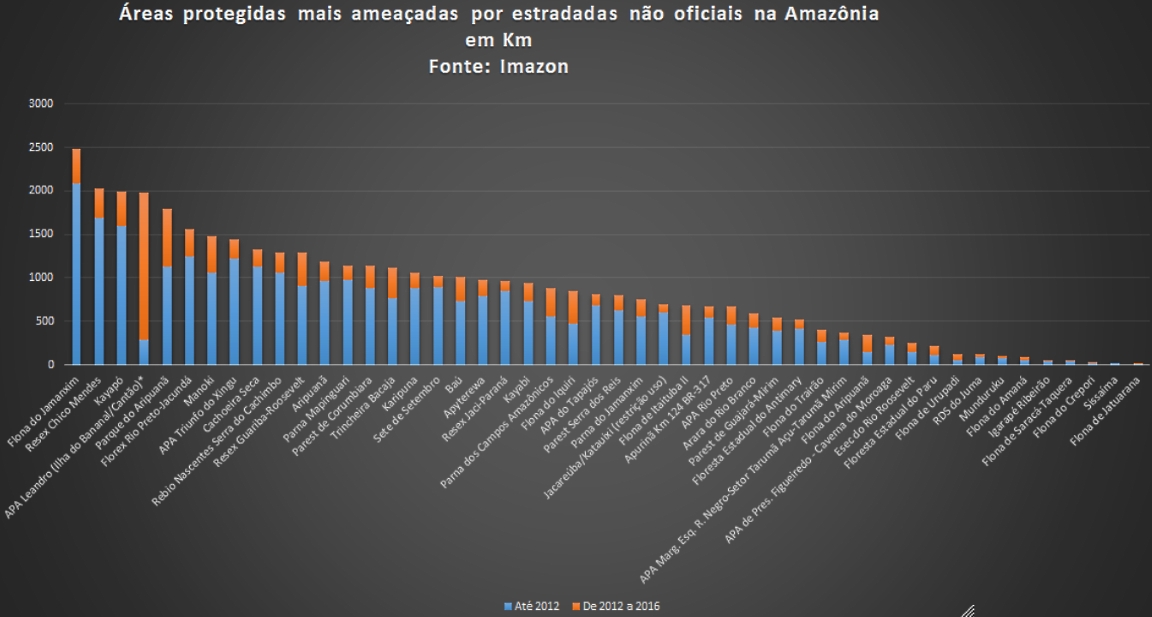 O Floresta Nacional do Jamanxim, com 1.301.120 ha, no Pará, mantém destaque negativo. Até 2012, era a área protegida mais ameaçada por estradas não oficiais. Embora ao longo de quatro anos tenha ficado em quarto lugar entre as ameaçadas, na soma do total de estradas mapeadas até 2012 e no período seguinte, até 2016, se mantém com a área protegida mais ameaçada por estradas irregulares na Amazônia.