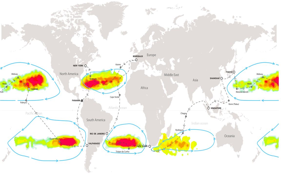 “Encontramos plástico em todo lugar, mesmo em áreas isoladas e bem preservadas”, explica Marco Simeoni, presidente da Race for Water e organizador da expedição. Em conversa com jornalistas na manhã desta quinta-feira, Simeoni explicou que embora seja possível encontrar resíduos em qualquer lugar, existem cinco grandes áreas que concentram a poluição devido às correntes marítimas. São as chamadas zonas de convergência. As manchas de poluição estão distribuídas nos oceanos Atlântico (Sul e Norte), Pacífico (Sul e Norte) e Índico, numa área que, juntas, totaliza duas vezes o tamanho do Brasil.