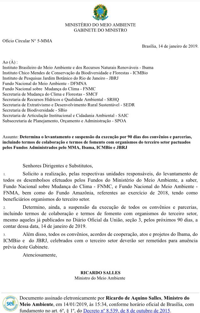 O Ofício Circular número 5 do Ministério do Meio Ambiente, publicado nesta terça-feira (14), que “determina o levantamento e suspensão da execução por 90 dias dos convênios e parcerias, incluindo termos de colaboração e termos de fomento com organismos do terceiro setor pactuados pelos Fundos Administrados pelo MMA, Ibama, ICMBio e JBRJ” fere o princípio da legalidade e levanta, sem elementos mínimos de prova, dúvidas sobre a idoneidade da sociedade civil.