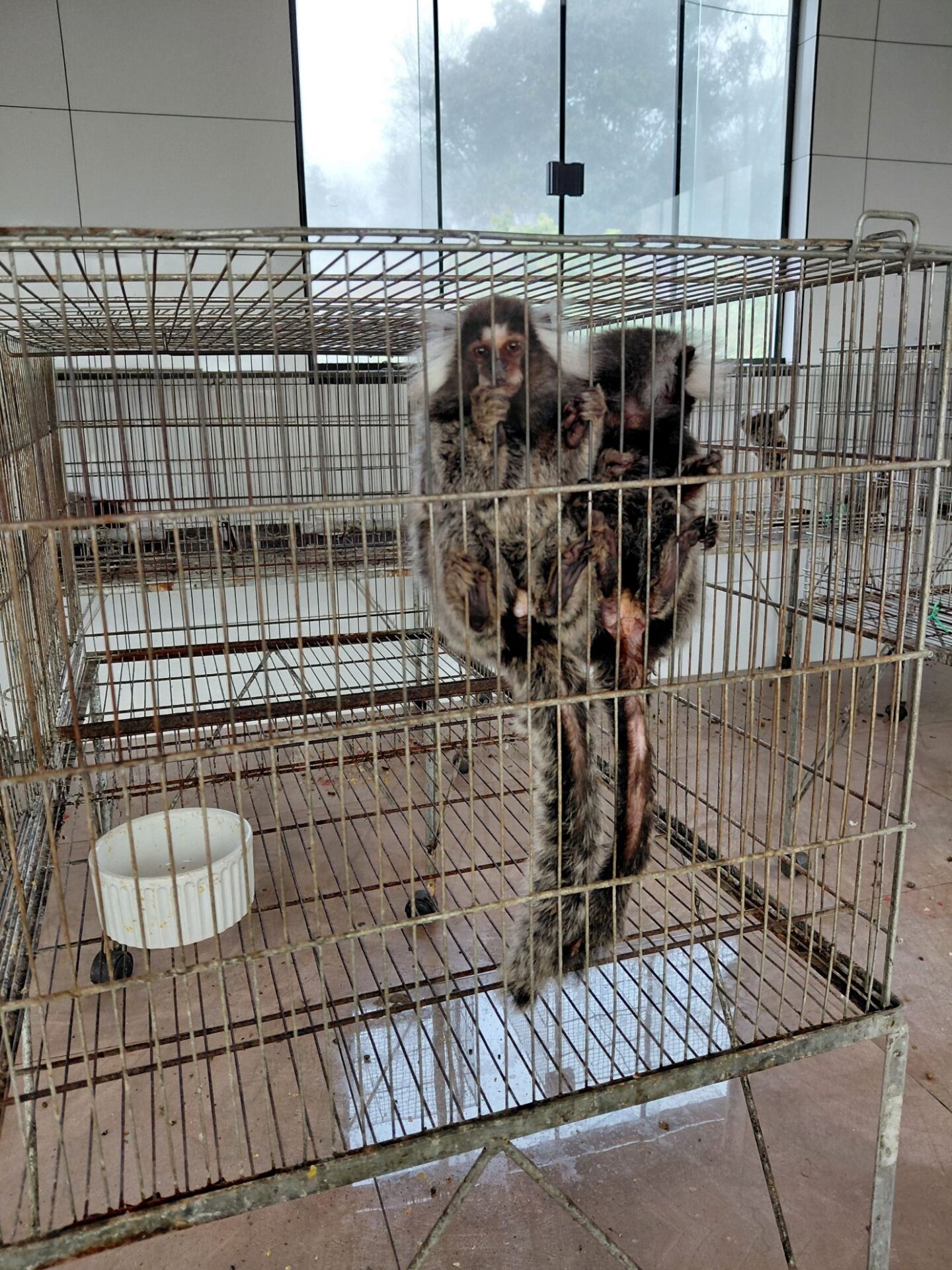 Os saguis não eram os únicos primatas mantidos em gaiolas. Alguns macacos-prego também estavam mantidos em jaulas pequenas na área externa, sem água ou comida, expostos ao clima e às intempéries.