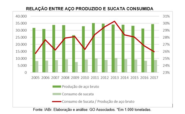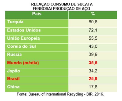 Atualmente, o país reutiliza cerca de 8,9 milhões de toneladas de sucata de ferro por ano, considerando a sucata de obsolescência – o chamado ferro-velho – e as produzidas industrialmente. Segundo estudo feito pelo Instituto Nacional das Empresas de Preparação de Sucata Não Ferrosa e de Ferro e Aço (Inesfa), a proporção consumo de sucata/aço produzido no Brasil é de 25,9%, número bem abaixo da média mundial (35,5%) e três vezes menor do que o país que mais tem a sucata como insumo da indústria siderúrgica no mundo: a Turquia (80,8%).