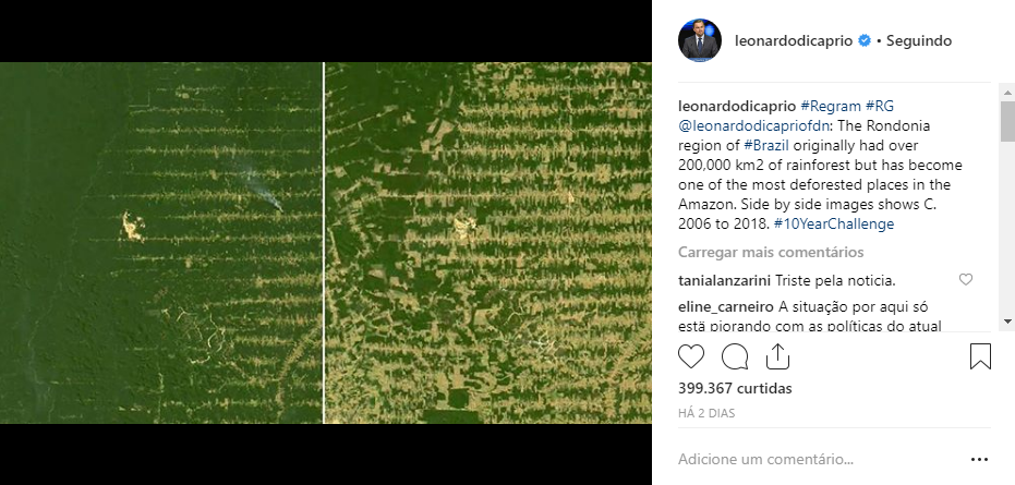 Na publicação, escreve o ator: “A região de Rondônia, no Brasil, originalmente, tinha mais de 200 mil km² de floresta tropical, mas se tornou um dos lugares mais desmatados da Amazônia”. E marcou com a hashtag #10YearChallenge (Desafio dos 10 anos).