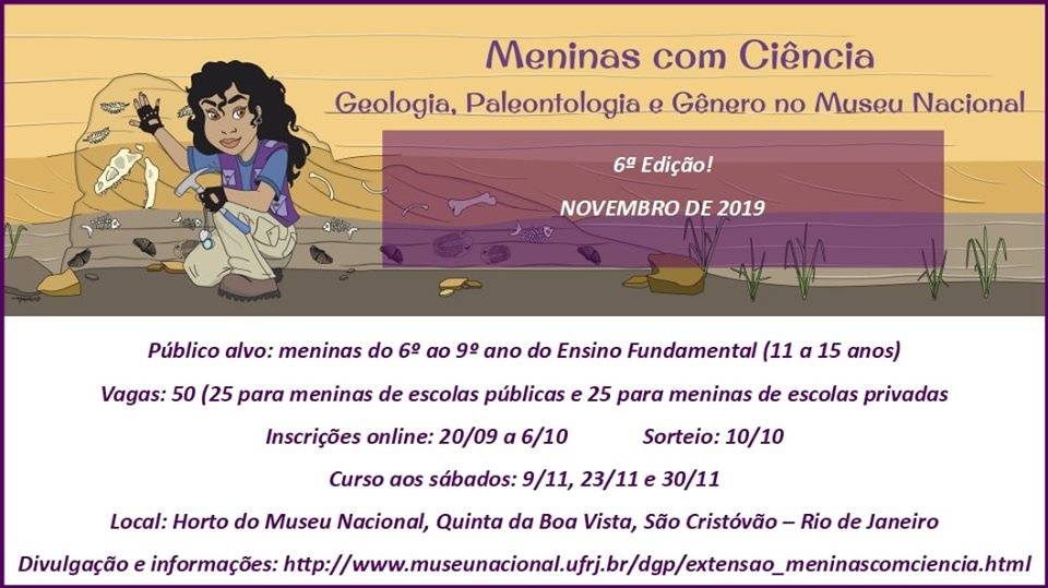 Idealizado por mulheres do Departamento de Geologia e Paleontologia do Museu Nacional (MN/UFRJ), o programa Meninas Com Ciência abre no dia 20 de setembro as inscrições vai para a sua 6ª edição. O curso de extensão é voltado para meninas de 11 a 15 anos que estejam cursando do 6º ao 9º ano do Ensino Fundamental.