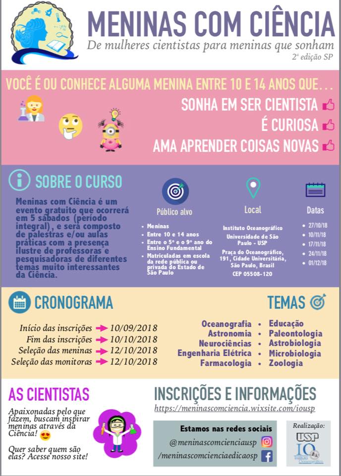 Se você é ou conhece alguma menina entre 10 e 14 anos, que está entre o 5º e o 9º ano do Ensino Fundamental e que sonha em ser cientista, saiba que será realizado o evento ‘Meninas Com Ciência’, no Instituto Oceanográfico da Universidade de São Paulo – USP, na Praça do Oceanográfico, 191, Cidade Universitária, São Paulo. As inscrições vão de 10 de setembro a 10 de outubro.