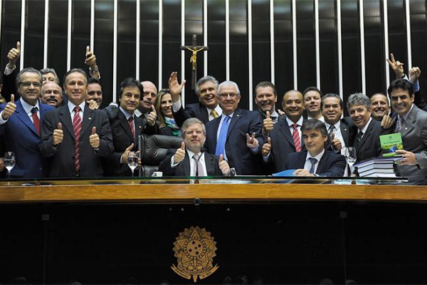 Marco Maia (PT-RS) posa junto com Paulo Piau e outros membros da bancada ruralista, a qual conseguiu aprovar o Código Florestal que queria. Foto: J.Batista/Agência Câmara →
