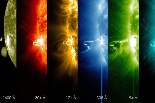 Em 24 de fevereiro de 2014, o Sol emitiu uma erupção solar que foi fotografada em diferentes espectros de luz. O resultado é esta bela imagem. Foto: NASA/SDO →