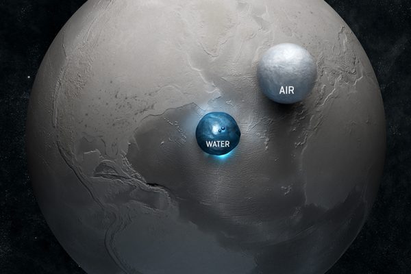 Na ilustração, as esferas representam toda a água e ar do planeta. E mostram a fragilidade da vida no planeta. Ilustração: Félix Pharand-Deschênes / Globaïa →