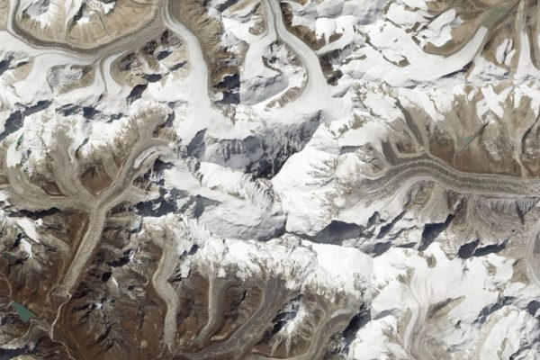 Ou, como é conhecida fora do Nepal, o Monte Everest. A campeã indisputada das quatorze montanhas na Terra que atingem mais de 8.000 metros de altura. Foto: NASA Earth Observatory →