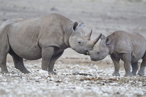 Mãe rinoceronte-preto (Diceros bicornis) e seu filhote no Parque Nacional Etosha, na Namíbia. O par fez uma rara aparição logo após o pôr-do-sol. Foto: Yathin S Krishnappa/Wikimedia Commons →
