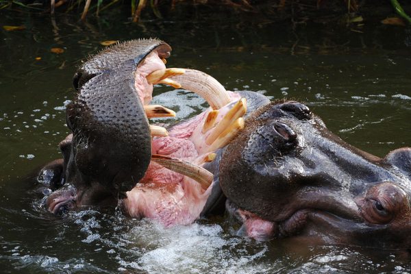 Dois hipoótamos (Hippopotamus amphibius) se "estranham" no zoológico de Adelaide, Sul da Australia. A briga não está longe... Foto: Peripitus/Wikimedia Commons →