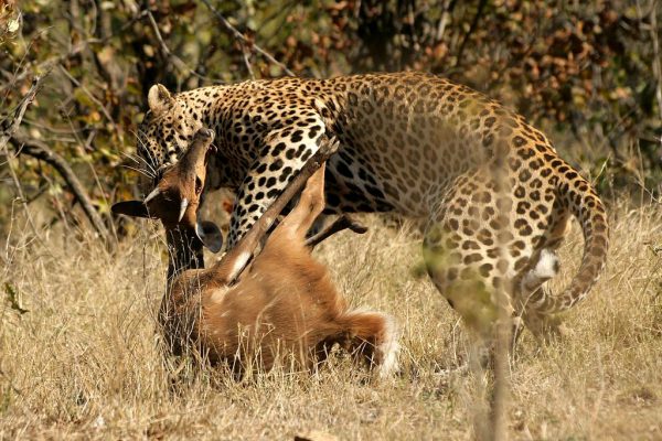 O leopardo (Panthera pardus), matando um jovem antílope bauala (Tragelaphus sylvaticus) no Parque Nacional Kruger, África do Sul. Foto: NJR ZA →