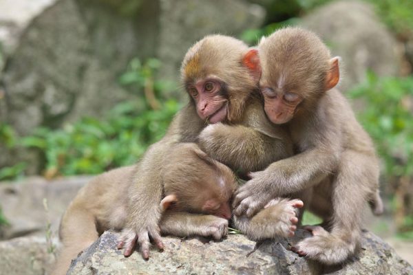 Três pequenos macacos-japoneses (Macaca fuscata) num singelo momento de confraternização no Parque de Jigokudani, Japão. Foto: Masachi →