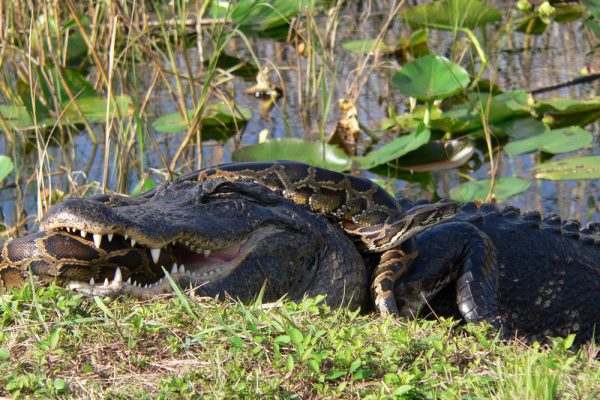Um jacaré americano e uma píton birmanesa travam um combate para descobrir quem prevalece no Everglades National Park, EUA. Foto: Lori Oberhofer →