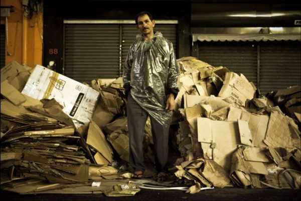 Na madrugada de 24 de dezembro, o que sobra na Rua 25 de Março, São Paulo, é lixo. João é dono de um dos 6 pontos de comércio de papelão. Foto: Victor Moriyama →