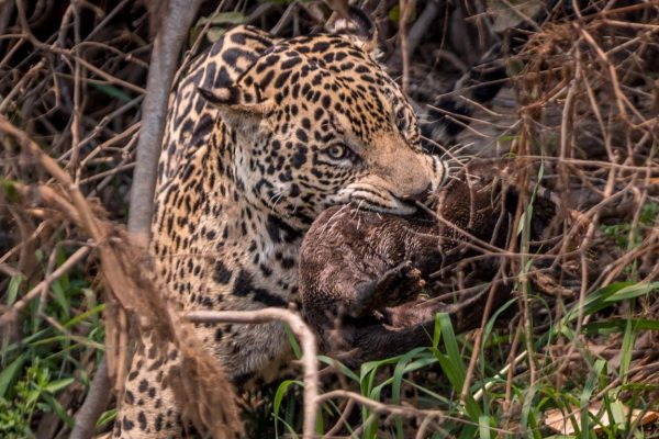 Onça-pintada tenta, mas não consegue se alimentar de um filhote de ariranha. Andar em bando ajuda na hora de fugir dos predadores →