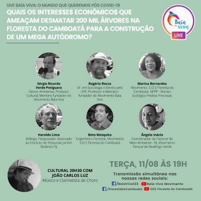 LIVE dia 11 de Agosto (terça-feira) às 19h com transmissão simultânea pelo Facebook e YouTube do SOS FLORESTA DO CAMBOATÁ & do MOVIMENTO BAÍA VIVA @SOSFlorestadoCamboatá & @MovimentoBaiaViva