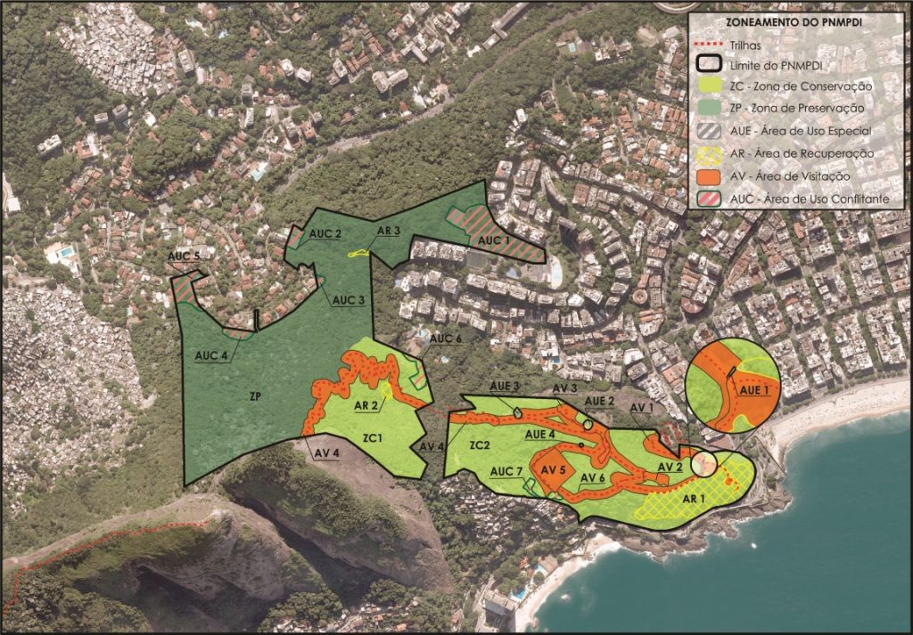 E quanto ao zoneamento do PNMPDI? Bem, estamos convictos de que zoneamentos não devem ser pautados por análises e procedimentos estatísticos, portanto, estabelecer comparações quanto ao percentual desta zona em comparação com outra ou com o todo do parque é completamente inútil para o processo de planejamento e gestão. Não zoneamos UC pensando em percentuais! O estabelecimento de zonas e “áreas” – termo de designação para “subzonas” utilizado no roteiro metodológico do INEA – obedeceu a análise dos atributos, dos potenciais e das limitações de cada porção territorial da unidade de conservação, apontados técnica, científica e rigorosamente pelos mais de 10 temas das áreas do meio físico, biológico e antrópico contemplados no estudo para a elaboração do PM, além das contribuições dos eventos participativos (reuniões com comunitários e autoridades municipais e do entorno da UC, Oficinas de Diagnóstico Rápido Participativo e de Planejamento Participativo). Sendo assim, todas as áreas com atributos e potenciais para usos públicos foram destacadas e orientadas para se consolidarem como “Áreas de Visitação” delineadas sobre Zona de Conservação, incluindo acesso aos paredões da face norte do penhasco (área de visitação AV-4). A Zona de Preservação delineada no PNMPDI foi estabelecida em território ainda em processo de recuperação florestal e, mais do que isto, onde não há atrativo notório ou atributo natural digno de justificar usos públicos. Corresponde também à área definida como de maior risco potencial à integridade da população pretensamente usuária que, definitivamente, não é formada apenas por trilheiros e montanhistas. O restante dos acessos às vias de escalada está totalmente fora do Parque e, portanto, não vemos prejuízos aos usos e acessos sabidamente de maior interesse do autor do artigo citado. Observe-se na figura abaixo o zoneamento do PNMPDI.
