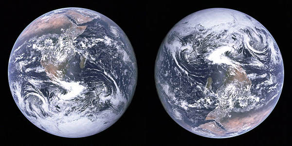 A Terra não parecia azul na primeira foto que a NASA, a agência espacial norte-americana, fez de nosso planeta em 1960. As imagens do satélite TIROS eram feitas em preto e branco. Foi no dia 7 de dezembro de 1972, a uma distância de aproximadamente 45.000 km, que a tripulação da Apollo 17 tirou uma das mais famosas e reproduzidas fotografias de todos os tempos: a Blue Marble. No meio da foto, o continente africano entre os oceanos atlântico e índico. No cantinho superior esquerdo podia ser visto um tufão, que dias antes havia alagado o estado indiano de Tamil Nadu. Como o planeta não leva em consideração mapas geopolíticos, do ponto de vista dos astronautas o continente antártico estava originalmente no alta da imagem, mas antes de ser divulgada para o público foi girada para a posição mais tradicional que conhecemos hoje.