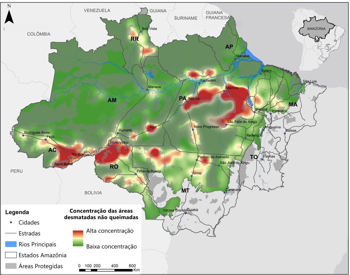 Quatro estados concentram 88% dessa área de 4.500 km² desmatada e não queimada: Pará, com 42%, seguido de Mato Grosso (23%), Rondônia (13%) e Amazonas (10%). Os pesquisadores mapearam 12 regiões preocupantes (veja o mapa) e afirmam que elas devem ser consideradas como prioritárias para ações de comando e controle, especialmente aquelas planejadas pelo governo federal, assim como para o planejamento de atendimento à saúde pelos governos estaduais.
