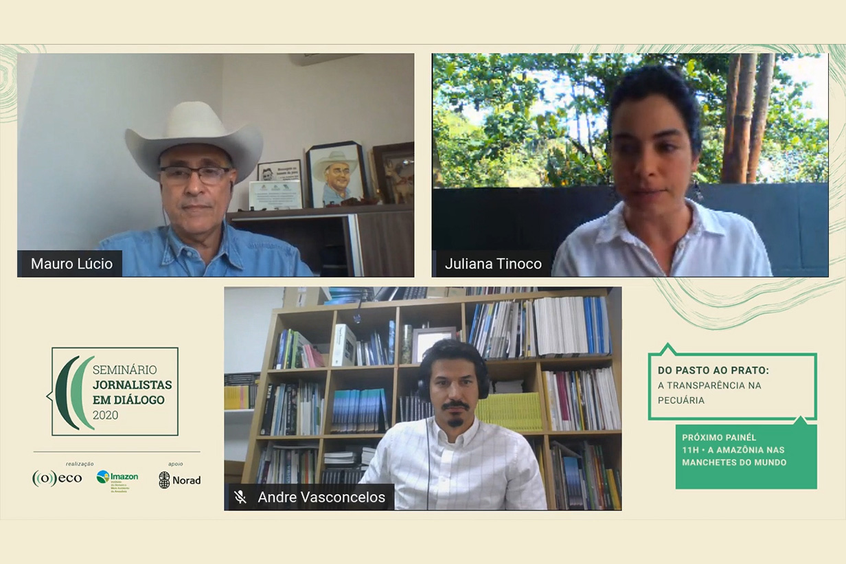 O Seminário Jornalistas em Diálogo, organizado por ((o))eco em parceria com o Imazon, chegou ao fim nesta quarta-feira (16). Os três dias de evento tiveram como objetivo principal, como o nome indica, promover um rico debate entre temas socioambientais e capacitar comunicadores. No encerramento, a primeira mesa trouxe um assunto muito discutido atualmente: a pecuária e sua relação, direta e indireta, com o desmatamento. A conversa foi enriquecida pelo pecuarista Mauro Lúcio Costa, vice-presidente da Associação de Criadores do Pará (Acripará), junto ao pesquisador André Vasconcelos, da Trase, empresa que faz o monitoramento da cadeia produtiva do gado para exportação. A mesa teve a mediação da jornalista Juliana Tinoco, da Partnerships for Forest.