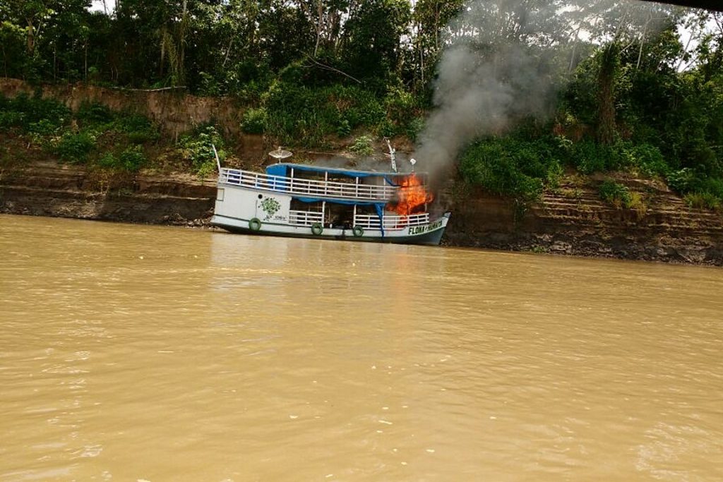 Barco do ICMBio pegando fogo. Foto: Divulgação.
