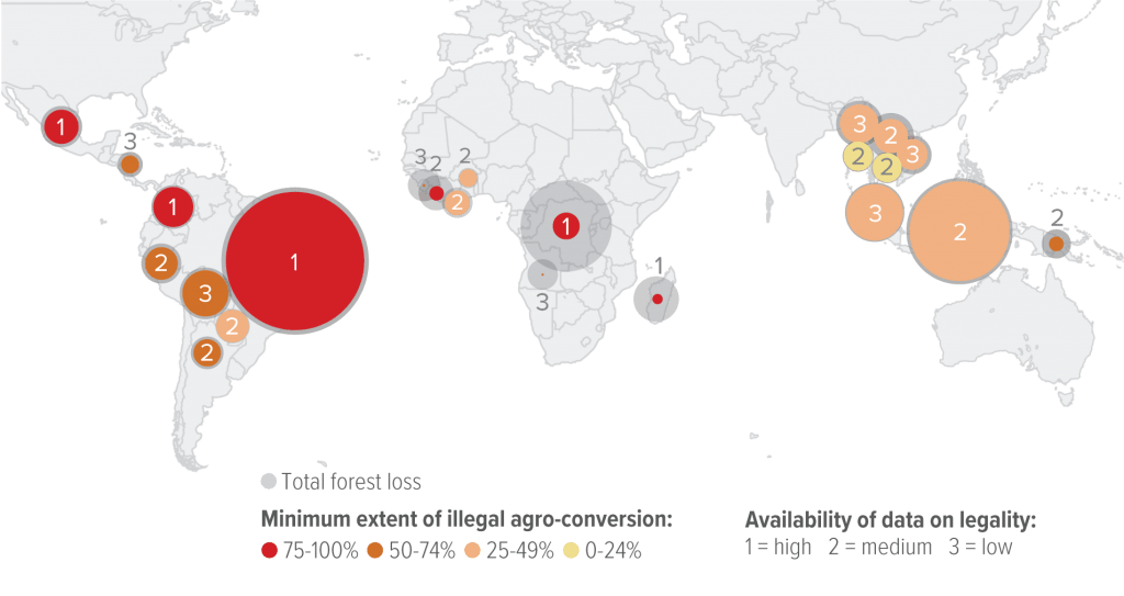 O estudo destaca ainda que 31% dessa área de floresta explorada pelo agronegócio no mundo – legal ou não – foi exportada para outros países, bem distantes das áreas de florestas tropicais devastadas, como Estados Unidos, China, Reino Unido e países da União Europeia. Um dos objetivos do relatório é justamente revelar até que ponto os itens agrícolas produzidos na América Latina, Sudeste da Ásia e África e exportados para todo o mundo estão relacionados à destruição ilegal de florestas. O Brasil, por exemplo, é visto como um país de alto risco de exposição ao desmatamento ilegal, pois em 2019 no mínimo 95% do desmatamento foi feito de forma criminosa.