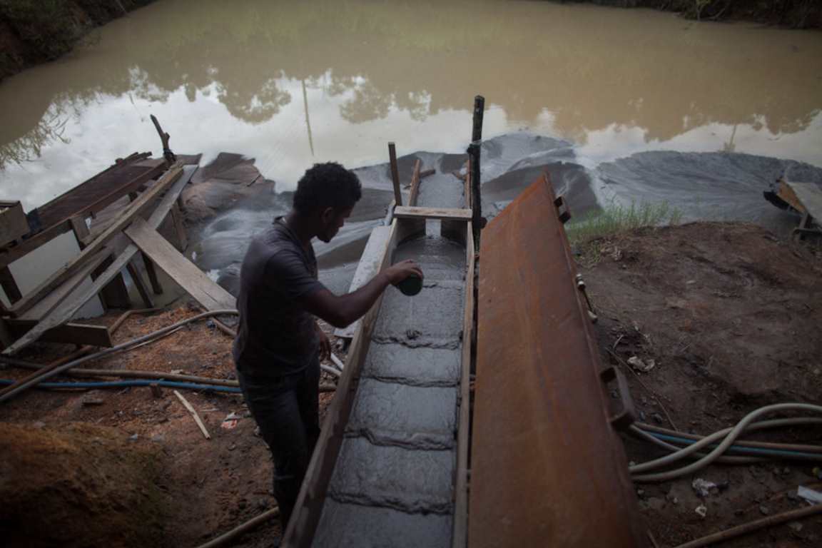 Quando o material é composto por pedregulhos, passa pelos chamados “moinhos”, máquinas que trituram a rocha. Após essa etapa, também seguem para o mesmo tipo de rampa que termina no tanque fechado com mercúrio.