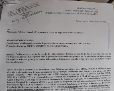 Diante dos problemas de odor, gosto e coloração diferenciados, identificados na água distribuída pela Cedae, o Movimento Baía Viva informou que protocolaria uma representação judicial na Procuradoria Geral da República (PGR) e no Ministério Público do Estado do Rio de Janeiro (MPRJ). Nessa mobilização, seria solicitada a declaração de estado de vulnerabilidade hídrica, além da adoção de um Plano de Alerta e Emergência para a garantia do abastecimento público no estado. Na denúncia, seria pedida, também, a responsabilização criminal de dirigentes da Cedae, da Secretaria de Estado do Ambiente e Sustentabilidade (SEAS), do Inea, assim como da Agência Nacional de Águas (ANA) e da Agência Reguladora de Energia e Saneamento Básico do Estado do Rio de Janeiro (AGENERSA).