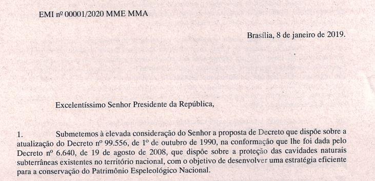 A alteração nos Decretos 99.556/1990 e 6.640/2008, que dispõem sobre a legislação das cavernas, foi encaminhada diretamente à Casa Civil em janeiro de 2019, sem consulta prévia aos principais atores no assunto. A proposta chegou à Advocacia-Geral da União (AGU) – que em janeiro deste ano concedeu um parecer positivo, mas solicitou a posição oficial do Ministério do Meio Ambiente. Apenas então, foi acionado o Centro Nacional de Pesquisa e Conservação de Cavernas (CECAV), em tese a autoridade técnica máxima no assunto de cavernas em âmbito federal, para elaborar um parecer.